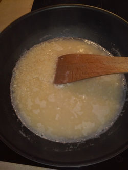 When the rice is almost ready add 6-7 spoons of brown sugar and a pack of pre-crushed starch to thicken the mixture.